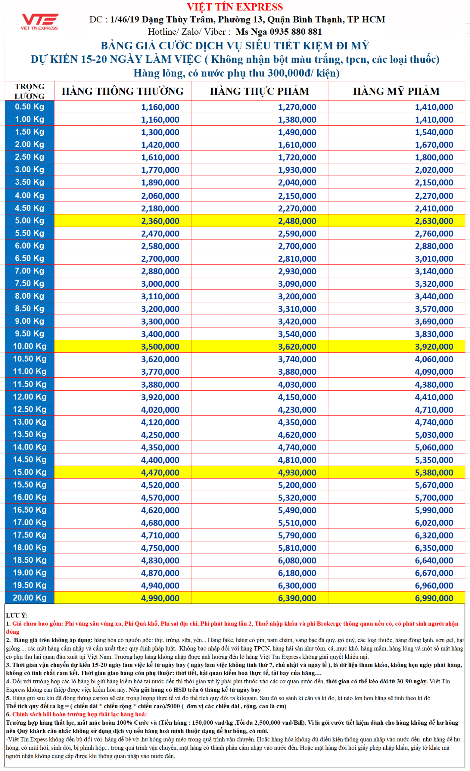 Bảng giá gửi hàng đi Mỹ hàng thông thường